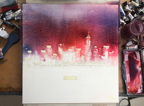 Among the various mediums that Rainbow works with, she found particular interest in the art of watercolor early on in her artistic career. Appreciating its fluid, flowing properties, it is “a medium that exudes life, movement, one that can never be fully controlled yet wholly beautiful in its nature”. Her intrigue with this form thus began her journey in painting watercolor nightscapes and cityscapes, embarking on the challenge of this unlikely pairing — soft and transparent watercolors, with dark and high contrasting nightscapes of the city.
