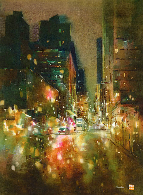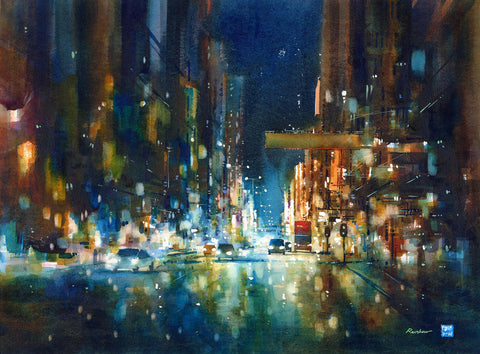 Among the various mediums that Rainbow works with, she found particular interest in the art of watercolor early on in her artistic career. Appreciating its fluid, flowing properties, it is “a medium that exudes life, movement, one that can never be fully controlled yet wholly beautiful in its nature”. Her intrigue with this form thus began her journey in painting watercolor nightscapes and cityscapes, embarking on the challenge of this unlikely pairing — soft and transparent watercolors, with dark and high contrasting nightscapes of the city.
