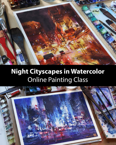 My Night Cityscapes in Watercolor class series is the one for you! In each class, I walkthrough the step by step breakdown of a specific cityscape painting.